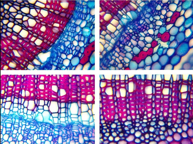 An meinen Fotos kann man erkennen, dass das Astrablau eher dominant ist. Das Safranin kommt nicht schön zur Geltung, da ich den Schnitt schlichtweg zu kurz damit färbte. Diesmal habe ich kein Dauerpräparat hergestellt, sondern in Wasser mikroskopiert. Somit kommen die Farben etwas klarer rüber ( in bestimmten Einschlussmedien sind kurz nach dem Einbringen des Schnittes die Farben ausgewaschen, dieser Effekt gibt sich jedoch im Laufe der Zeit). Die Fotos habe ich mit einer kompakten Digitalkamera an einen etwas besseren Euromex- Mikroskop aufgenommen.