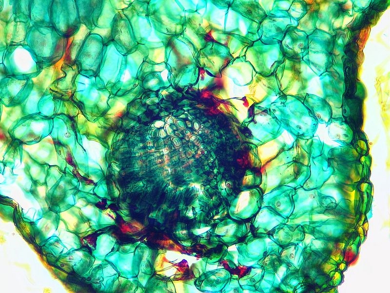 Hier zeigt sich besonders, dass der Schnitt etwas zu dick geraten ist, eine saubere Unterscheidung der einzelnen Leitgewebe ist nicht bzw. nur sehr schwer möglich, zumal sich Teile des Leitbündels verschoben haben.