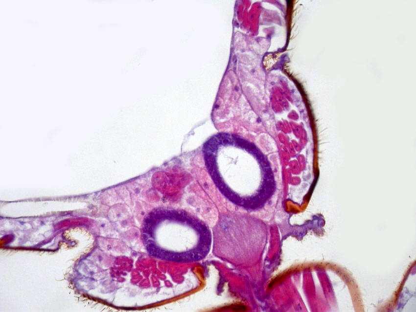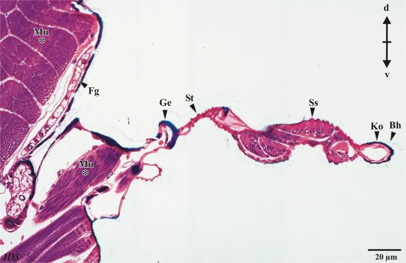 anknüpfend an Deinen obigen Beitrag möchte ich eine Aufnahme von der Haltere einer der von Dir bereitgestellten Mücken (Limoniidae) zeigen, die im Ganzen quer geschnitten wurde. Im Vergleich zu einer Haltere einer Fliege (Brachycera) ist die Haltere einer Mücke (Nematocera)filigraner ausgebildet. In der Aufnahme habe ich folgende Abkürzungen verwendet: