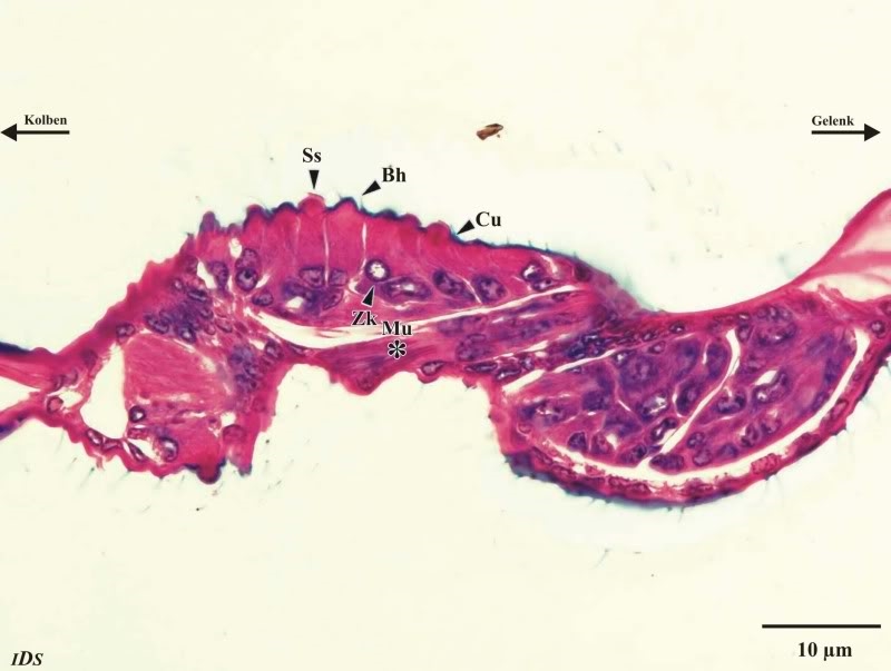 Gut zu sehen sind auch die Sensillen. Könntest Du diese Stelle bitte einmal etwas mehr vergrößert zeigen?