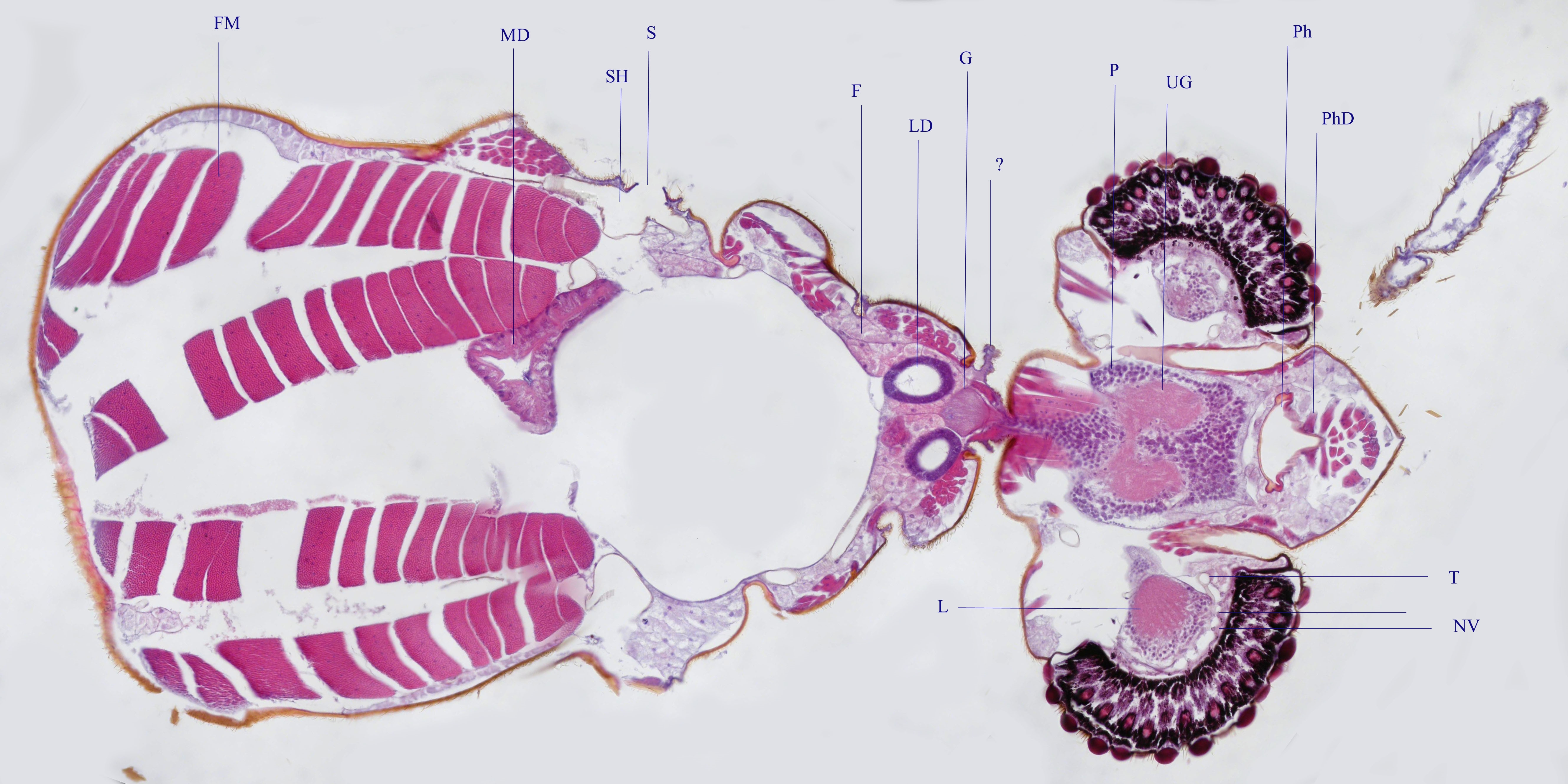 Bezogen auf den Kopf handelt es sich um einen Horizontalschnitt etwa am ventralen Ende des Unterschlundganglions. Aufgrund der Kopfstellung der Mücke ist der Thorax dann beinahe quer geschnitten.