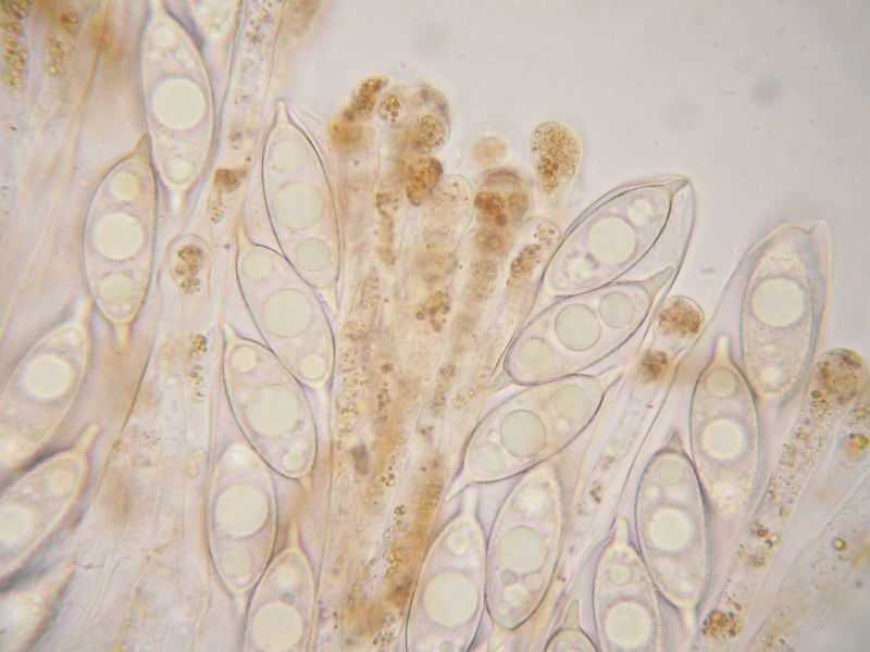 Nun zu den mikroskopischen Merkmalen: Sporen hyalin, elliptisch, reif fein netzig und an den Polen mit spitzen, hyalinen Anhängseln, 24-30 x 13-14 µm. Asci IKI negativ, achtsporig und bis zu 350 µm lang und 17 µm breit.