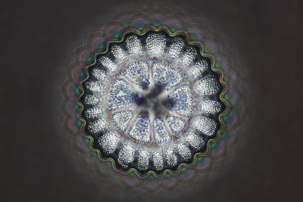 da lese ich doch gerade den Satz ... es muss nicht immer DIC sein  ;D , nein für Farbe im Bild geht es auch mit anderen optischen Techniken. Hier ein kleines Beispiel was der Heine Kondensor zaubern kann  ;) Die Farben sind nicht am PC gezaubert, sondern auch so im Okular zu sehen und nur durch die Eigenheit der variablen Ringblende entstanden. Und da mühen sich Mikroskopiker ab Diatomeen völlig unbunt zu zeigen  ::)