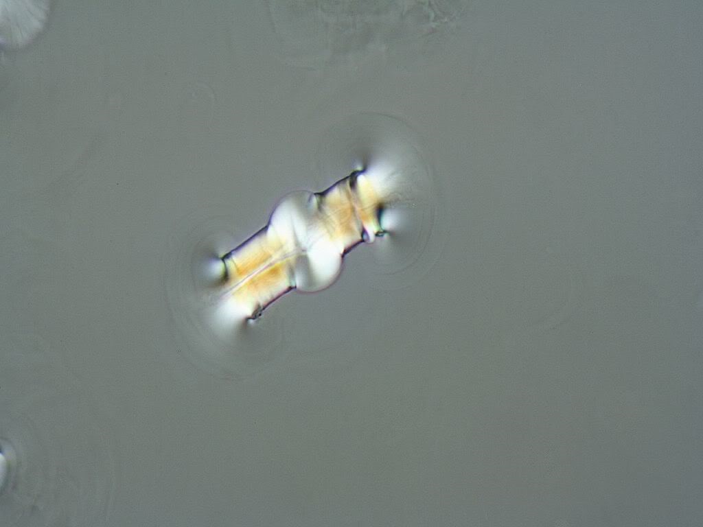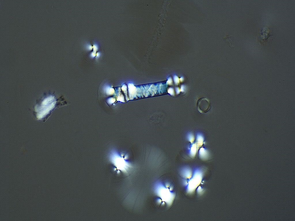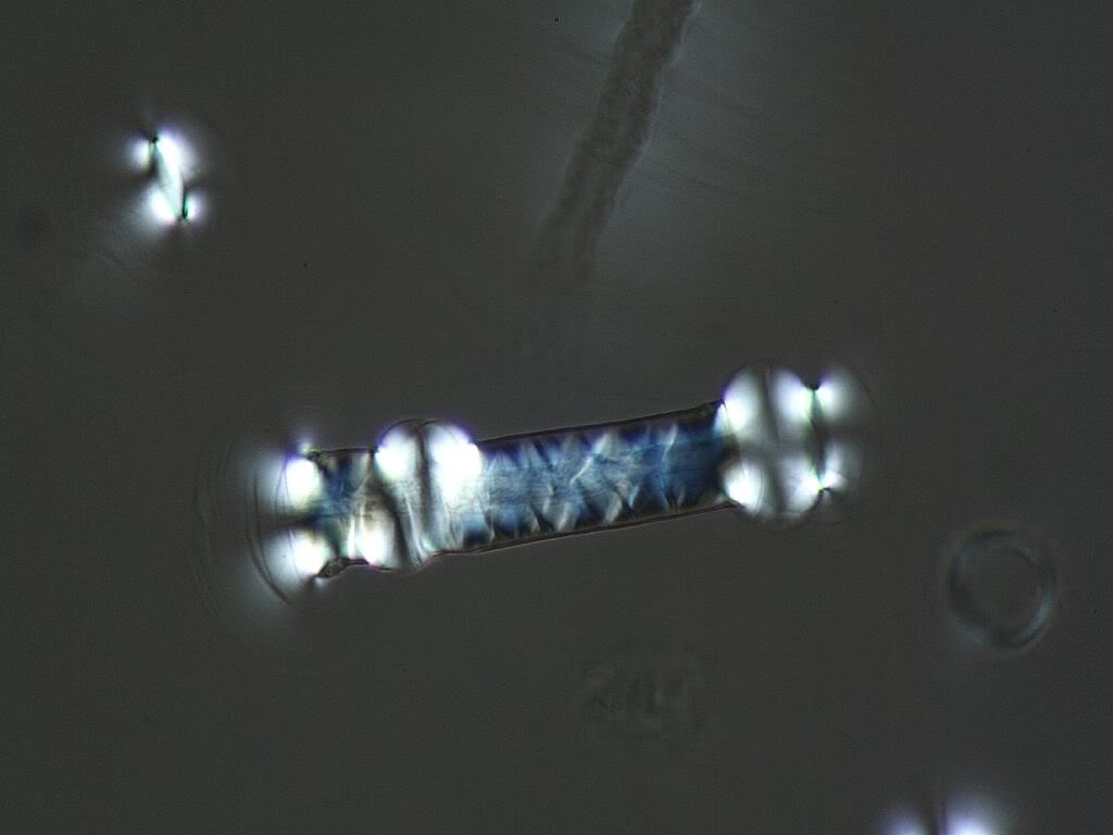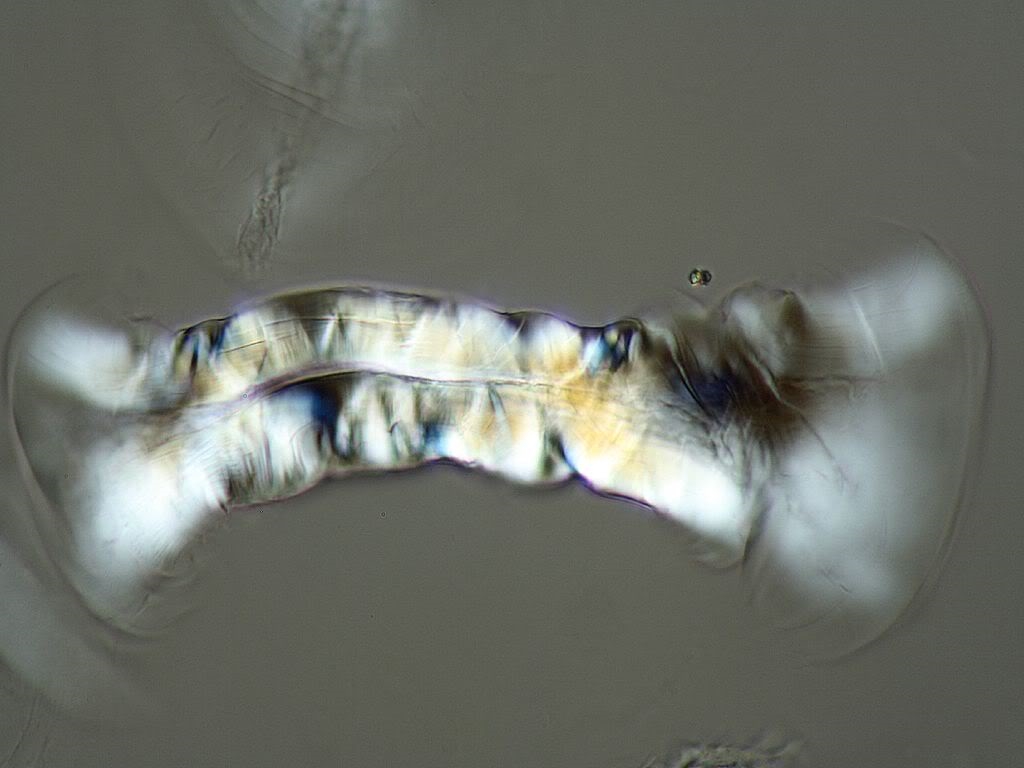Ich habe diese Fasern bei nicht ganz gekreuzten Polarisatoren betrachtet. Dadurch habe ich ein noch helles Bild erhalten, auf dem die Enden der Fasern, die sogenannte Pilzkopfquellung, deutlich zu erkennen ist.