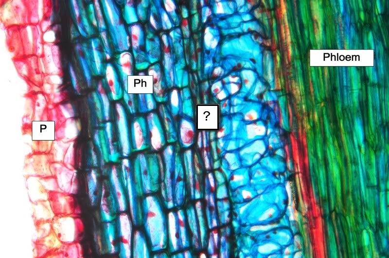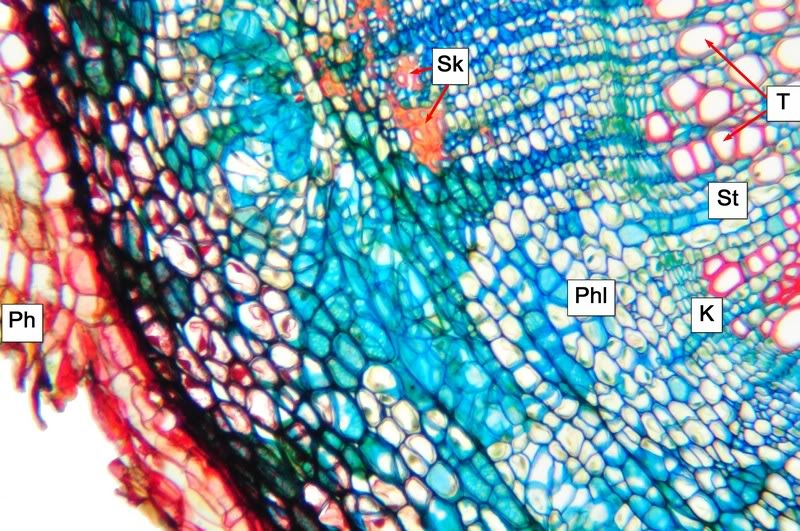 Ph = Phellem (Kork), Sk = Sklerenchym, Phl = Phloem, K = Kambium,  St = Strahl, T = Tracheen