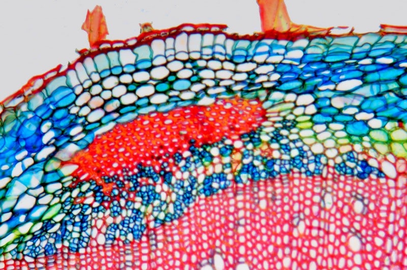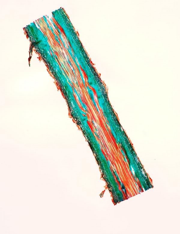 Zellwände blaugrün bis grün, verholzte Zellwände leuchtend rot. Zellwände der äußeren Hypodermis orangerot, Cuticula gelb. Zellwände der innenliegenden Hypodermis tiefrot, Suberin hellrosa.