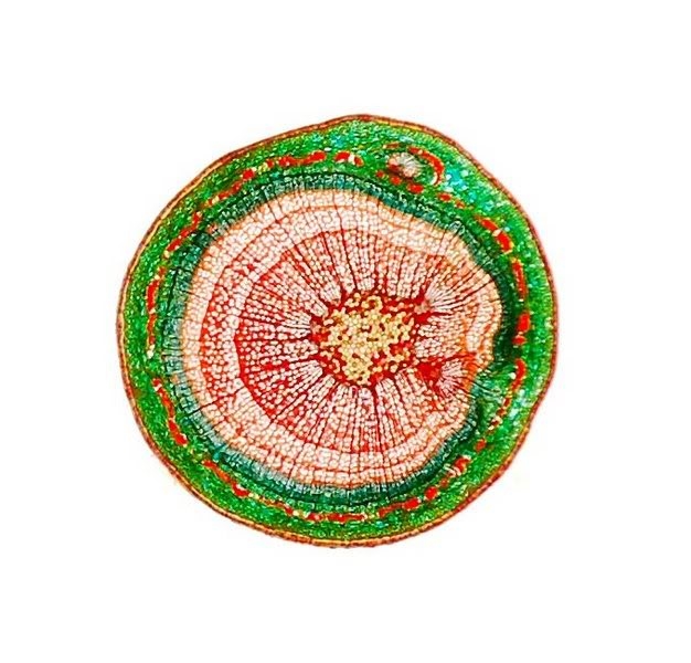 Das Leitbündel im Rindenparenchym (Bild 6) könnte zu einer weiter oben liegenden Verzweigung gehören - z.B. zu einem der Kurztriebe, an dem dann Blätter und Früchte ansitzen, wie es in der Illustration (Bild 1) auch schön gezeigt ist. Oder es ist eine Blattspur eines direkt am Spross ansitzenden Blattes.