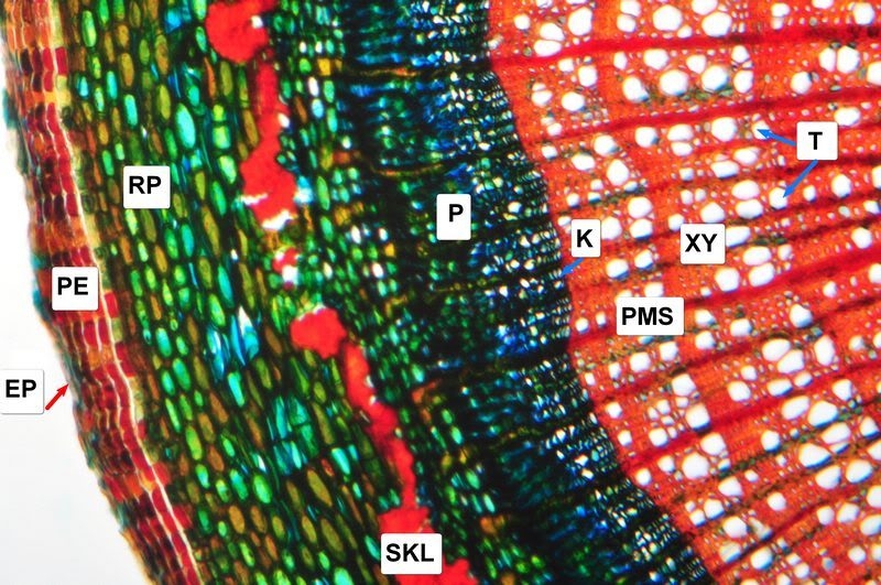 EP = Epidermis, PE = Periderm, RP = Rindenparenchym, SKL = Sklerenchym, P = Phloem, PMS = Primärer Markstrahl, K = Kambium, XY = Xylem, T = Tracheen