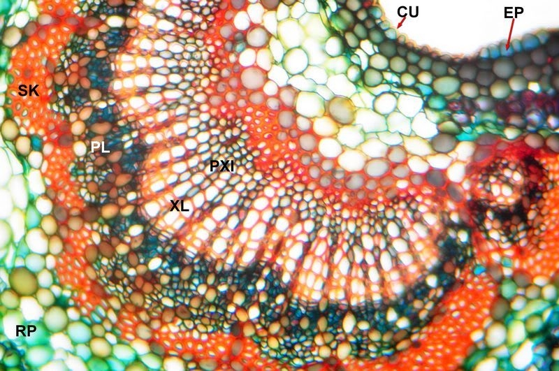 RP = Rindenparenchym, SK = Sklerenchymring, PL = Phloem. XL = Xylem, PXI = Primäres Xylem ( Proto- und Metayxlem), EP = Epidermis, CU = Cuticular