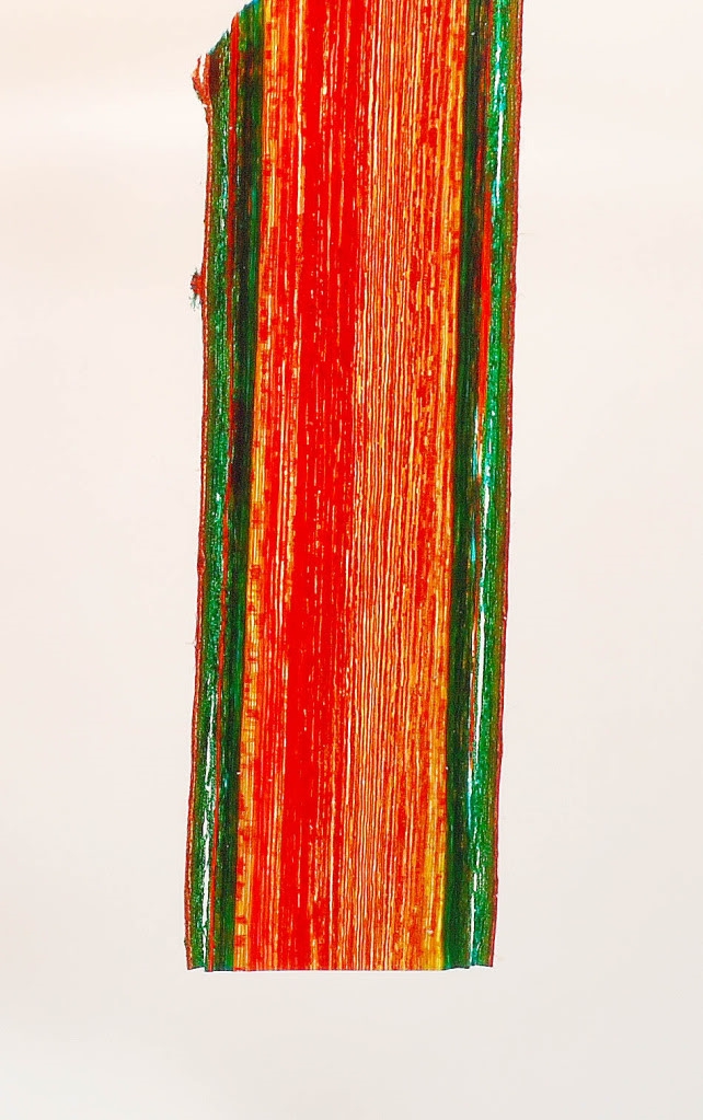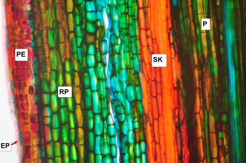 Zellwände blaugrün bis grün, verholzte Zellwände leuchtend rot. Zellwände der äußeren Hypodermis orangerot, Cuticula gelb. Zellwände der innenliegenden Hypodermis  tiefrot, Suberin  hellrosa.