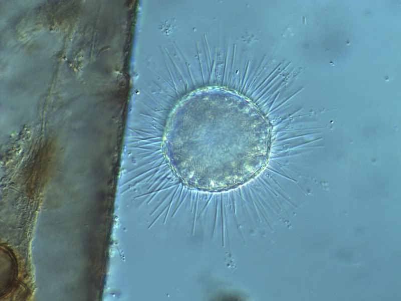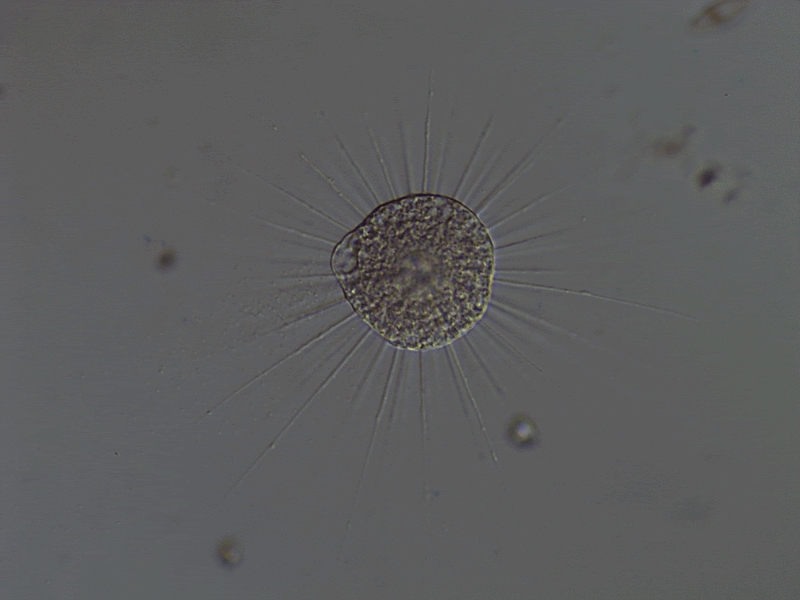 Ein Exemplar mit deutlich kürzeren Filopodien, ebenfalls ca. 250 µm groß war (auf einem anderen Objektträger) aber munter unterwegs, dieses habe ich mit dem 40x Objektiv aufgenommen: