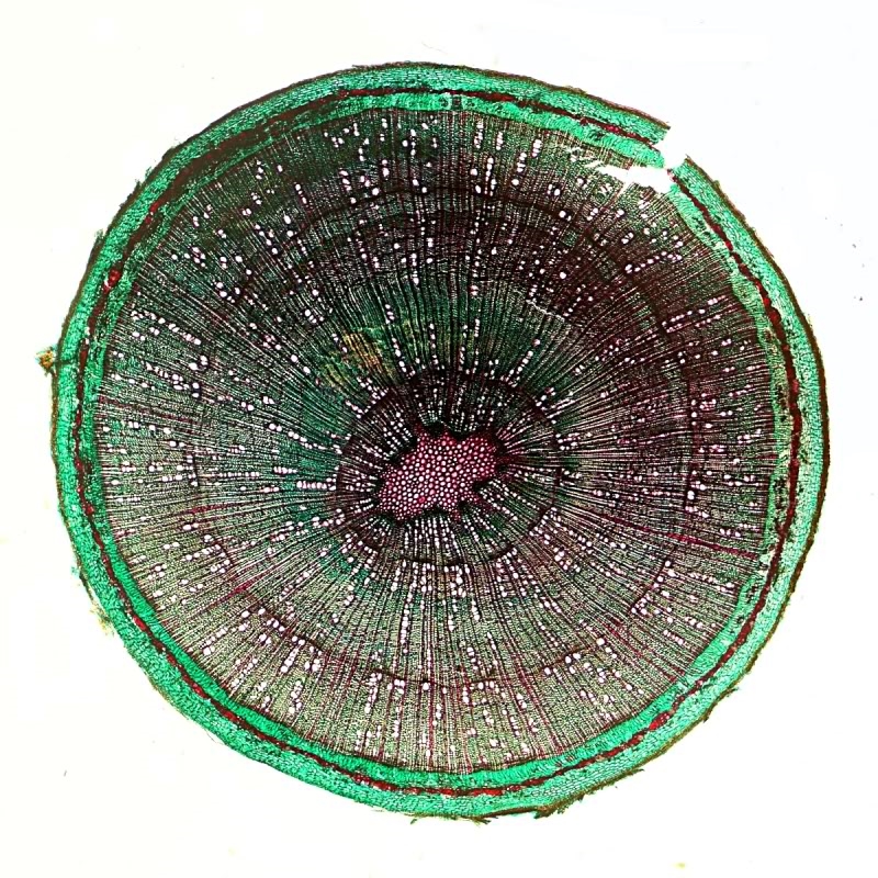 Bei Deinem Schnitt ist Färbung der lignifizierten Zellwände partiell kräftiger ausgefallen. Man sieht das sehr schön im Bereich 11 Uhr bis >15 Uhr von der Mitte ausgehend nach außen.