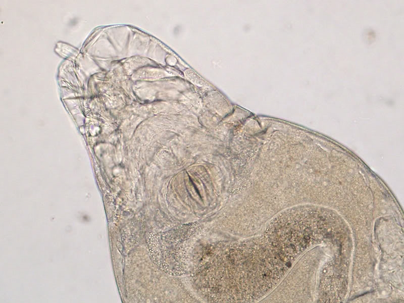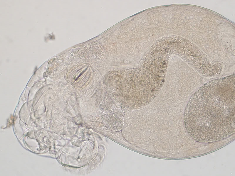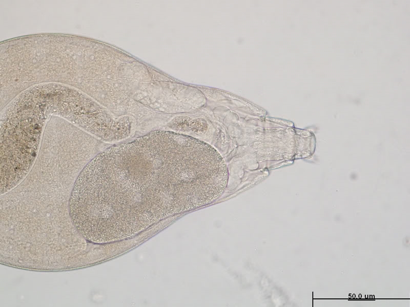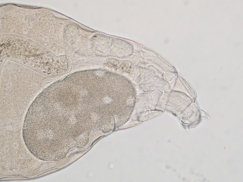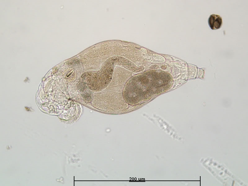 Da hast du dir ein schwieriges Objekt vorgeknöpft!  Für Einsteiger ist der  "Wassertropfen" ein hervorragendes Buch, wobei der sinnvolle Einsatz nicht immer ganz einfach ist.  Im Bestimmungsteil über Rädertiere behandelt die erste Seite bezüglich der Rädertiere die sog. bdelloiden (egelartigen) Rädertiere, von denen die gezeigten Arten im Wasser vorkommen. Das von Walter fotografierte Tier stammt jedoch aus einer Laubstreuprobe, also aus einem ganz anderen Lebensraum und wird sich deshalb mit dem "Wassertropfen" nicht bestimmen lassen. Bdelloide Rädertiere lebend zu bestimmen ist außerordentlich schwierig. Man muss zumeist die Zehen bzw. deren Anzahl erkennen, um überhaupt die Gattung bestimmen zu  können. Das funktioniert im seltensten Fall beim lebenden Tier. Auch auf Walters Bildern , die ein totes Tier  zeigen, das  zudem zerquetscht ist,  sind die Zehen nicht zu erkennen (die Sporen schon, aber die die sind weniger wichtig). Deshalb ist selbst die Bestimmung der Gattung nicht möglich.