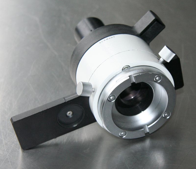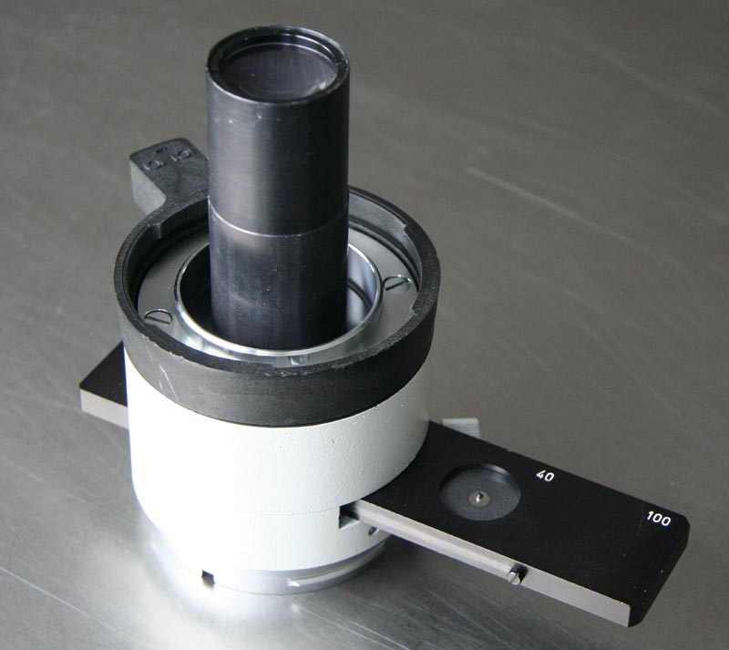 Das hier ist ein Zwischentubus der an die Orthoplan-Lampenaufnahme passt. Ein justierbarer Schieber enthält zwei Zentralblenden. Am ehesten fällt mir dazu der Reflexionskontrast ein. Allerdings sind mir nur 50er und 100er RK-Objektive bekannt. Der Schieber hat aber eine "40" und eine "100" Markierung.