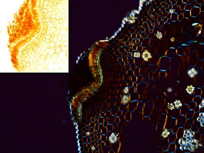 das Photo zeigt einen Querschnitt durch einen Lindenzweig im polarisierten Licht, gekreuzte Polarisatoren, ohne Hilfsobjekt. Das kleine Bild links oben zeigt das gleiche Präparat ungefärbt im Hellfeld.