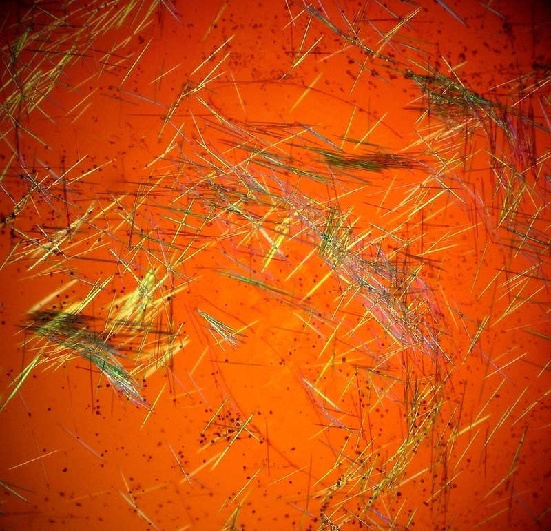 Bild 5: Die Kristalle im polarisierten Licht mit Hilfsobjekt (Acryl)
