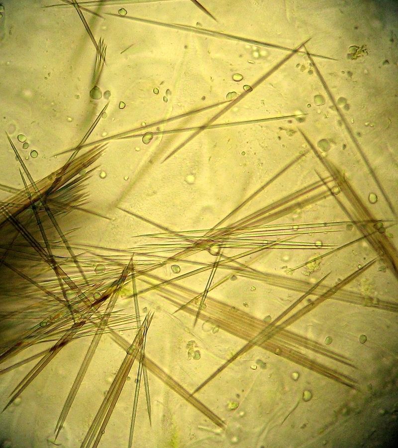 Bild 6: Die Kristalle liegen in massiven Bündeln innerhalb großer Zellen (polarisiert und Hilfsobjekt Acryl)