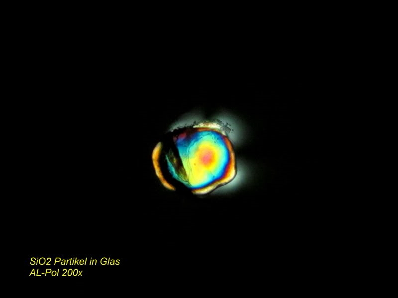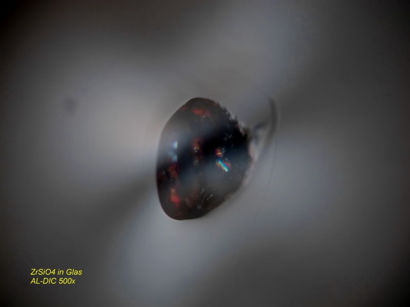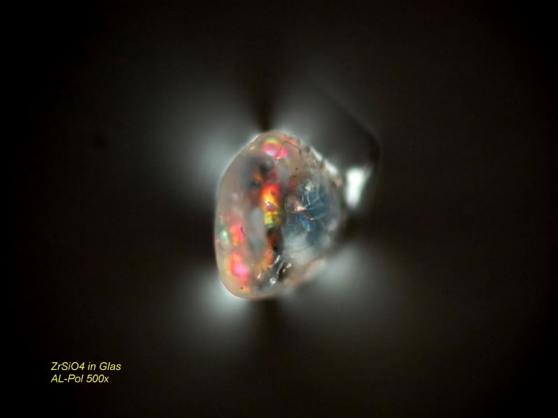 Beim Zirkon sieht man schön die Spannungsdoppelbrechung im Glas um den Fremdkörper herum.