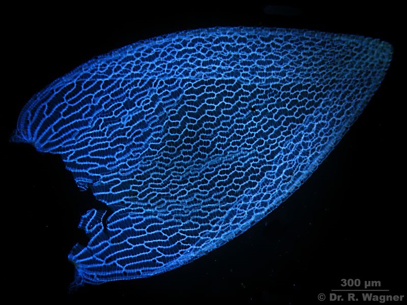 bei dem hier gezeigten Bild handelt es sich um echtes Zufallsprodukt. Ich wollte eigentlich die Fluoreszenz des Chlorophyll in diesem Moosblättchen fotgrafieren. Dies ist deshalb nicht gelungen, weil ich ein Dauerpräparat (Einschluss in Medium nach APATHY) genommen habe. Chlorophyll fluoresziert aber nur, wenn es noch "lebt". Meine UV LED hat einen kleinen Blauanteil, der hier zur blauen Färbung des Mossblättchens geführt hat. Die Aufnahme wurde in Durchlichttechnik mit Kondensor in Dunkelfeldstellung gemacht.