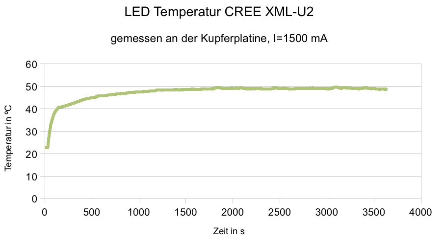 Man sieht sehr schön dass die Temperatur bei 1500 mA nicht weiter als auf 50 ºC ansteigt. Somit sollte ein vorzeitiges Altern der LED unwahrscheinlich sein.