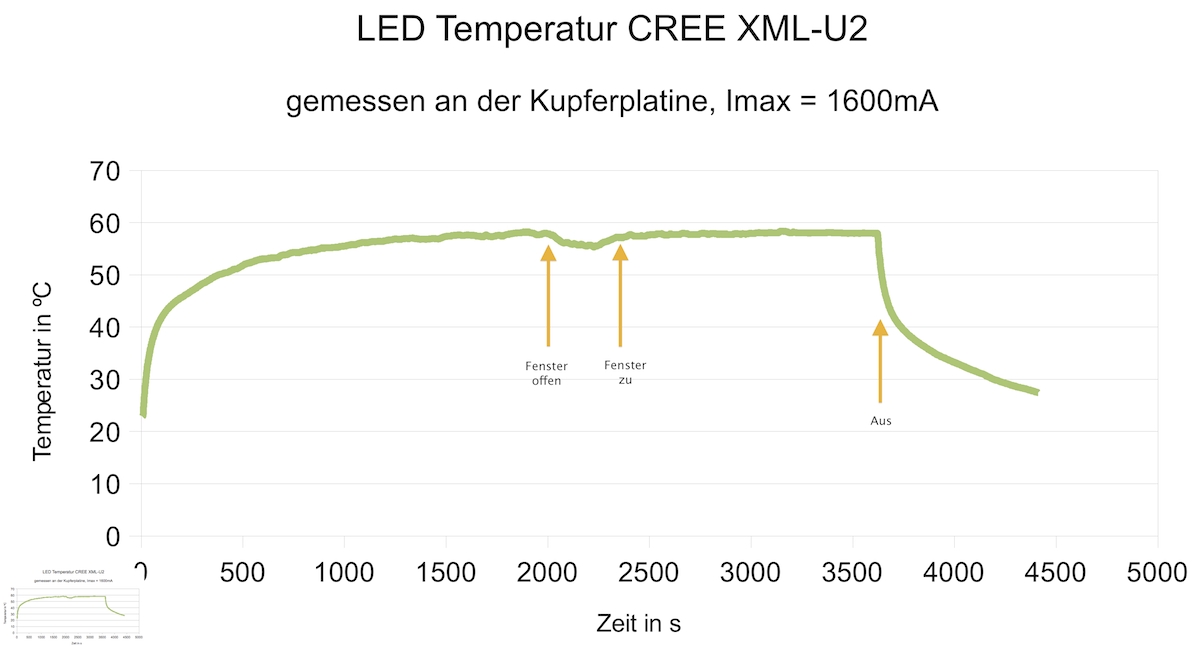 Ein interessanter Punkt ist, dass während der Messung das Fenster geöffnet wurde (2m vom Messaufbau entfernt), und dass die Änderung der Rahmenbedingungen einen messbaren Einfluss auf die LED Temperatur hatte. Stichwort: Konvektion...
