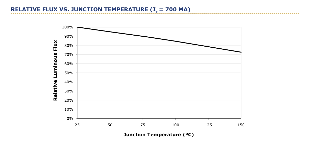 Der Graph aus dem Datenblatt der CREE XML zeigt die relative Lichtleistung in Abhängigkeit zur Temperatur. Bei 60 ºC befinden wir uns immer noch gut über 90 % der relativen Lichtausbeute, gegenüber den Standardlaborbedingungen von 25 ºC.