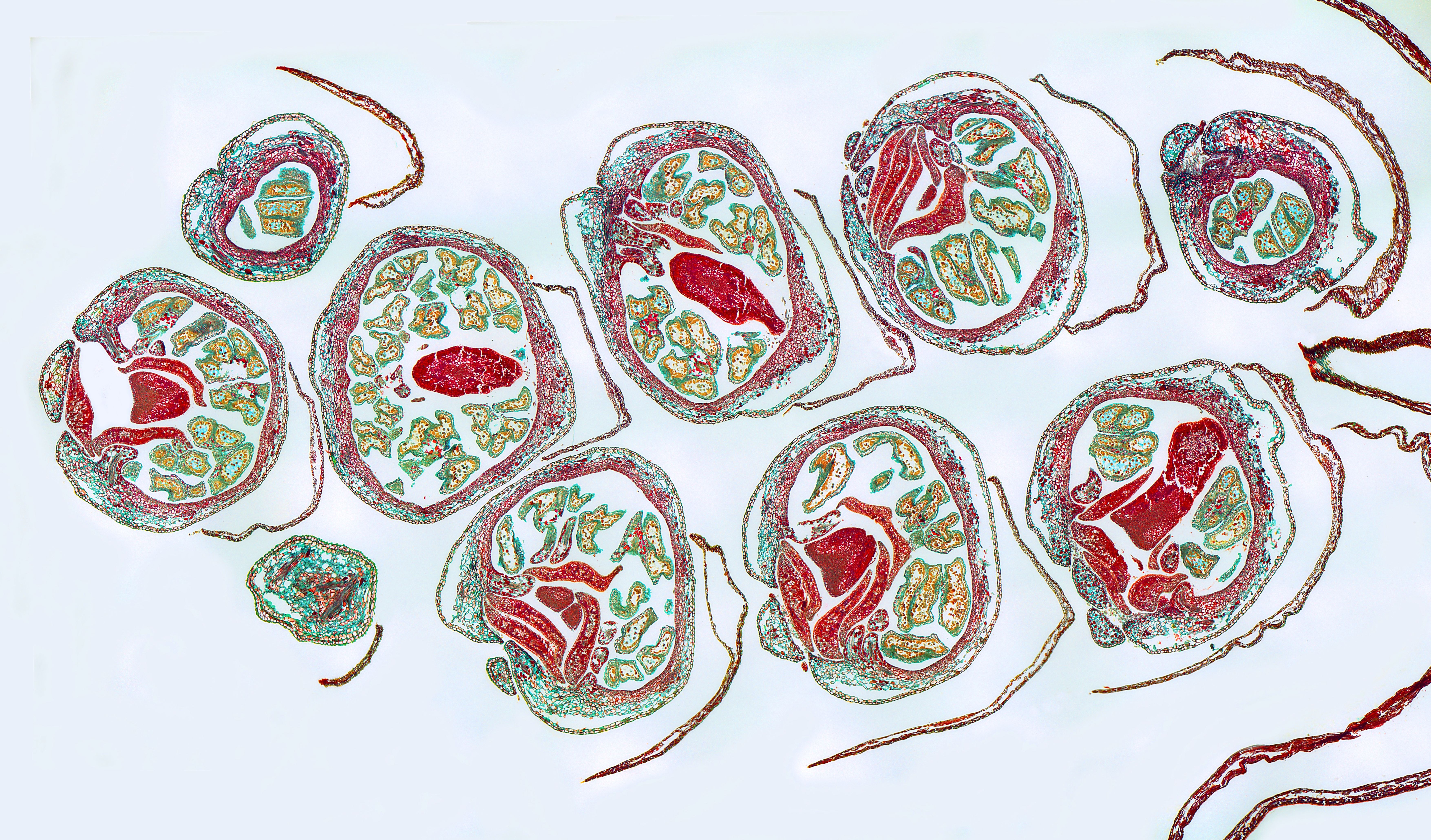 Ein 6µm dünner Längsschnitt durch die Traube (raceme) und mit W3A gefärbt zeigt ein herrliches Feuerwerk an Farben.