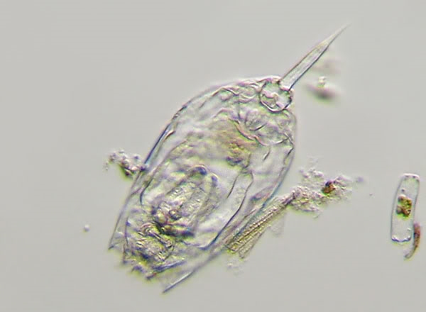 Größe: ca. 200 µm. Der Kauer sieht aus wie bei den allgegenwärtigen Lecane sp., doch ist im Wassertropfen nichts Passendes zu finden. Wer hilft mir bitte weiter?