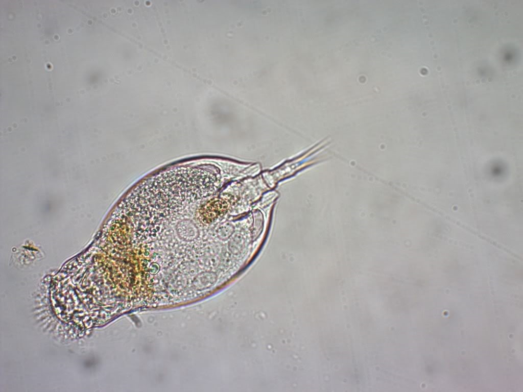 Ulf hat natürlich Recht: Die stark "granuläre" Zeichnung und der fast "Schwrazweißkontrast" lasen eine sehr weit geschlossene Aperturblende vermuten. Bei den Algen fällt das nicht so auf, bei den Rädertierchen schon. Mit weiter aufgezogener Blende hättest Du vermutlich auch weniger augeprägte Farbsäume.