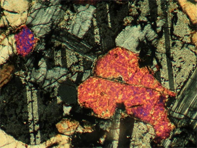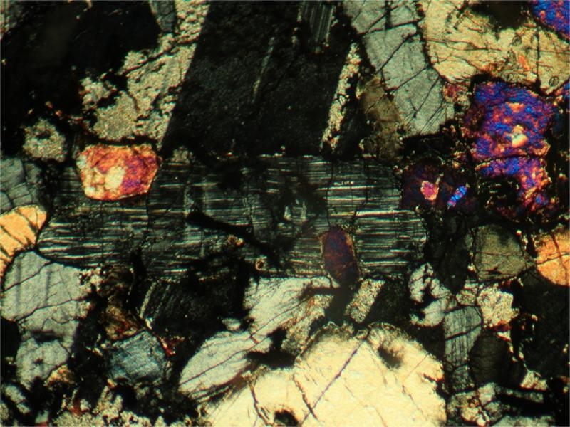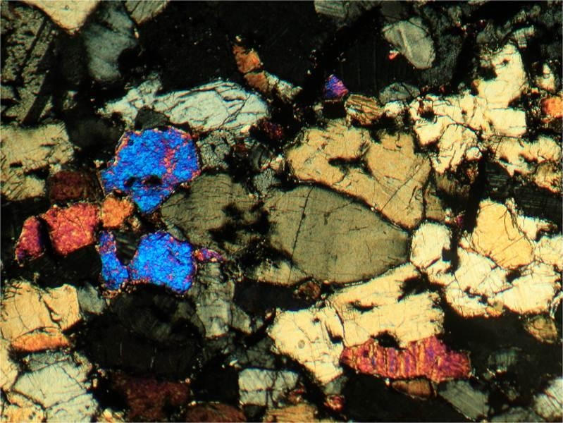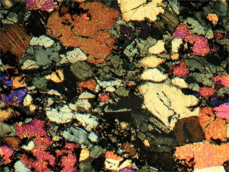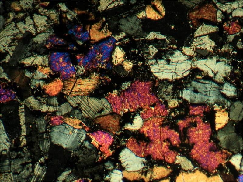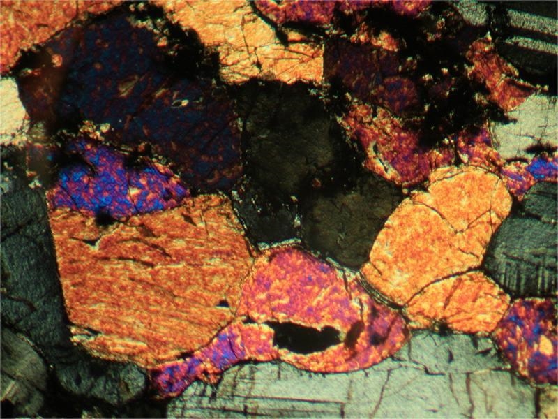 Die Grenzen der einzelnen Minerale sind unregelmäßig gekurvt. Die Olivine sind durch Schock teilweise zerbrochen. Bei dem undurchsichtigem, schwarzen Material handelt es sich um Graphit.