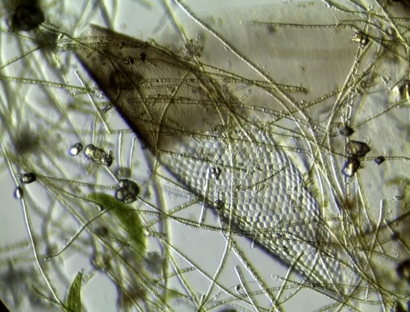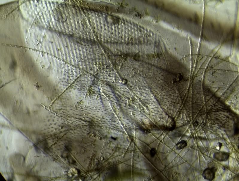 Da möchte ich Rolf beipflichten. Das kann sogar  Teil einer Exuvie sein. Der Bereich neben drann passt dann auch mit den kurzen Haaren. Bei einem Flügel müßte noch etwas vom Geäder zu sehen sein. Allerdings würde diese Vermutung schon mal den in Frage kommenden Kreis an Häutungstieren zum Beispiel auf Zikadenarten einschränken. Darüber hinaus kann es auch von einer Larvalhäutung bei einem Wassertier stammen ? Bin mal gespannt, wer uns sagt, welche Art das war. ;D