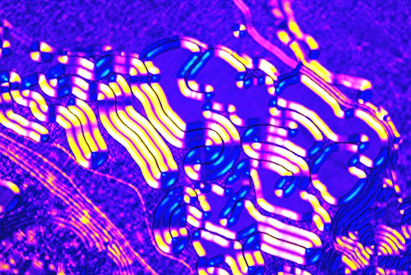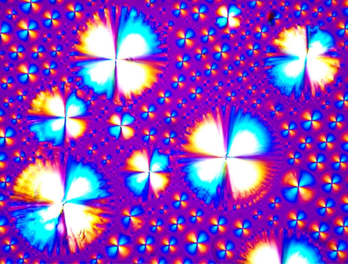Kein LSD, sondern was ganz Alltägliches: Texturbilder lyotroper Mesophasen  - flüssigkristalline Phasen in konzentrierten wässrigen Tensid-Lösungen ("... macht Wasser nasser") unterm Polarisations-Mikroskop (mit Lambda-Plättchen).