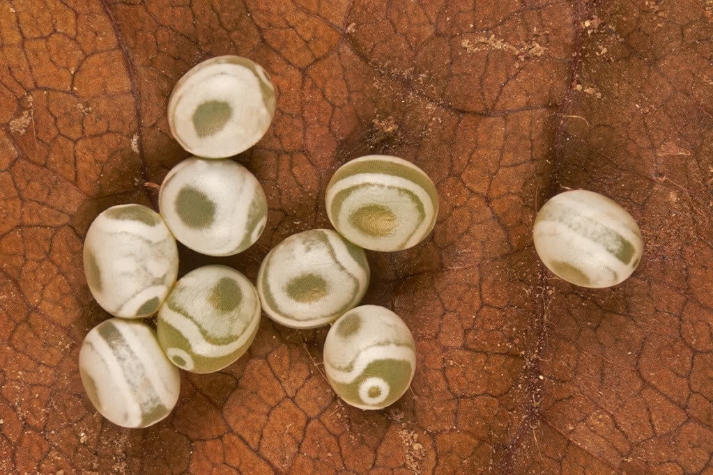 da die Eier an einem alten, braunen Blatt liegen, würde ich Falter, Schwärmer etc. ausschließen, da ich annehme, dass diese ihre Eier ausnahmslos an den grünen Futterpflanzen ihrer Raupen ablegen.