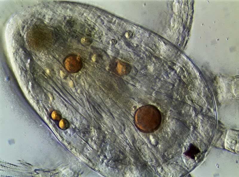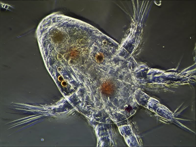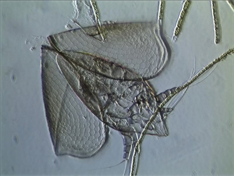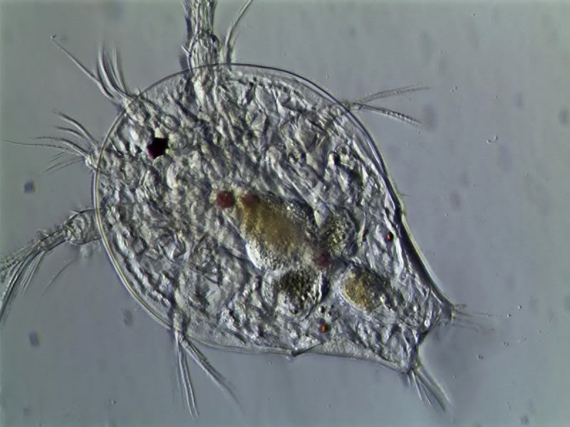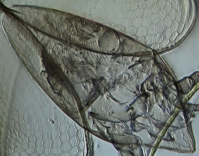 Schöne Aufnahmen. Das erste Bild zeigt den leeren Panzer eines Rädertieres (Keratella quadrata). Die anderen Bilder zeigen eine Cladocere ("Wasserfloh"), die auf dem Rücken liegt. Das wäre eigentlich die Gelegenheit gewesen, die Beine mit den Reusenborsten zu zeigen.