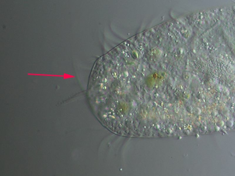Diesen Ciliaten habe ich in einer abgestandenen Tuempelprobe gefunden. Er hat tatsaechlich lang genug stillgehalten um einige Aufnahmen zu machen. Die anderen kleinen Objekte in der oberen Bildhaelfte sind Kahmhautbakterien.