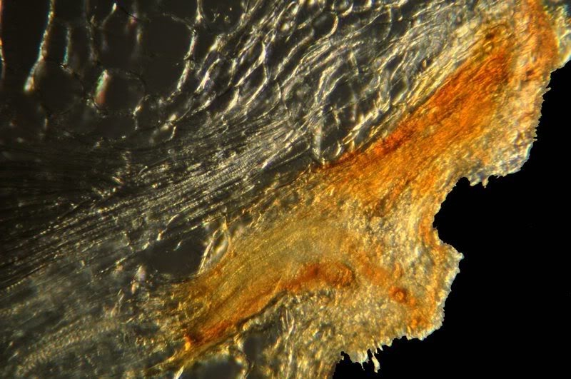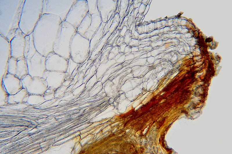 Schon hier ist zu erkennen: es gibt außer einigen "gefüllten" Epidermiszellen kein Rot im Schnitt - somit sind keine wirklich ligninhaltigen Zellen vorhanden.