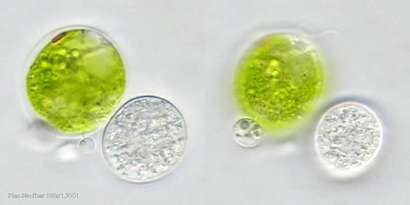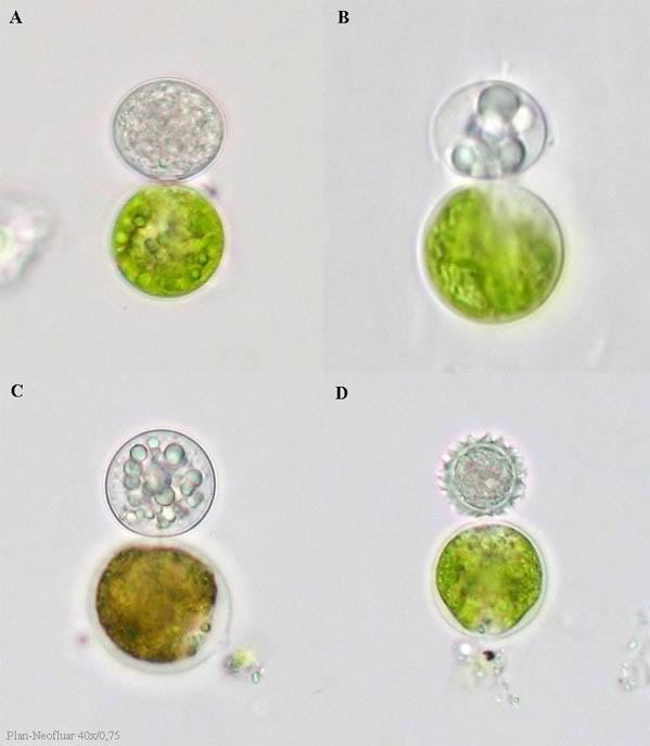 Das erste Foto zeigt Zoosporangien (A – C) und eine Dauerspore (D). Die Größe der Grünalgen beträgt ca. 25 µm.