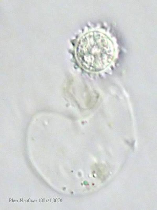 Bild 5 zeigt eine Dauerspore auf der leeren Hülle einer begeißelten Grünalge.