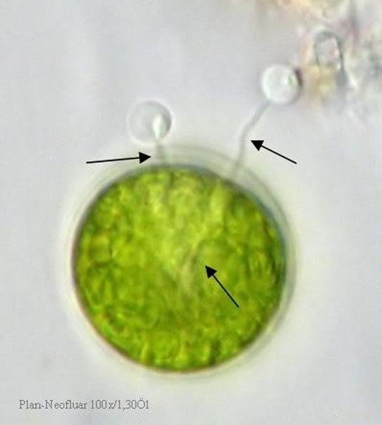 Im Bild 4 sind zwei Zoosporangien und die zugehörigen Rhizoide (Pfeile) zu sehen.