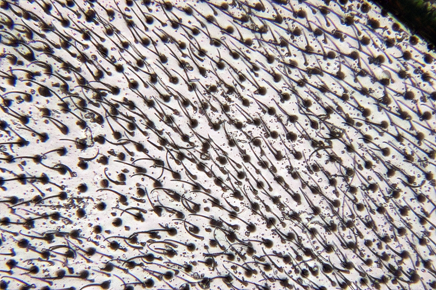 Hier noch das ergänzende Übersichtsbild: Nur die Richtung der Härchen ist mit Stift angezeigt, die Härchen sind selbst so wegen der geringen Vergrößerung nicht erkennbar: