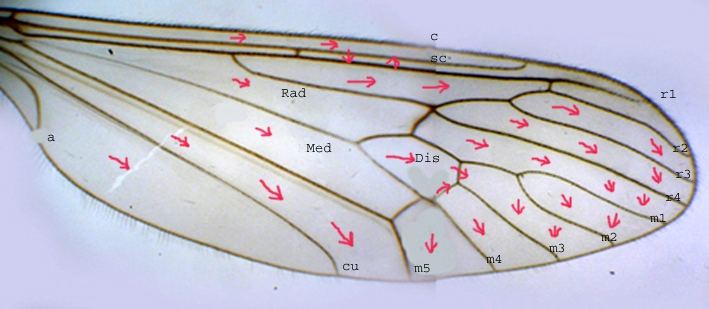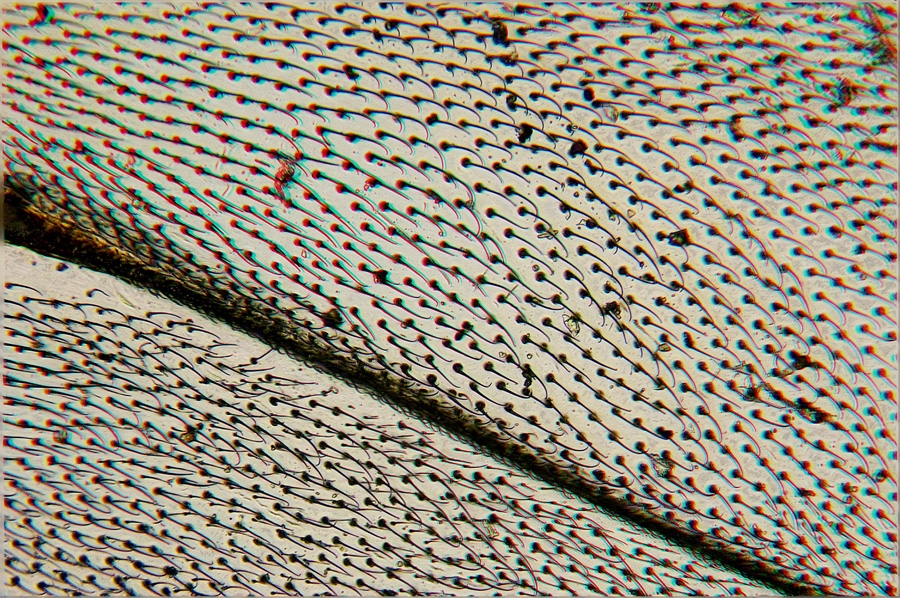 Und ich wette, liebe Heike, dass die Haare nicht in allen Flügelfeldern in exakt die gleiche Richtung stehen, weil sie bestimmt eine aerodynamische Bedeutung haben. An einem Mückenflügel habe ich das einmal untersucht. Dort waren die Härchen am unteren Rand der Flügelspitze nach unten gerichtet, im übrigen seitlich zur Flügelspitze hin.