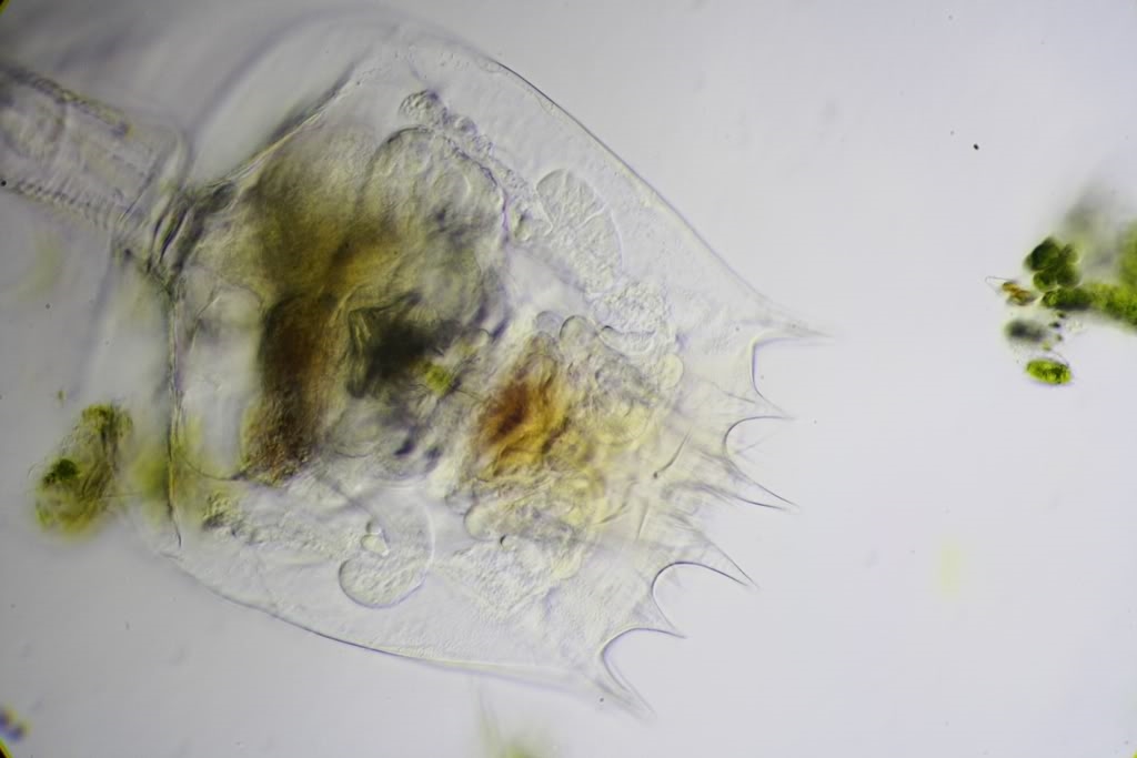 Dieses Exemplar ist zwar klein für Brachionus urceolaris, aber die vorderen Dornen sehen aus wie die im Wassertropfen abgebildeten.