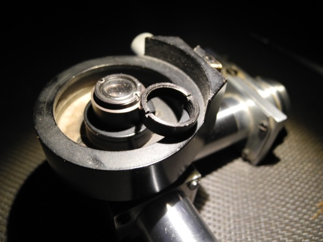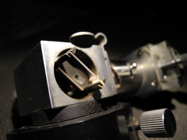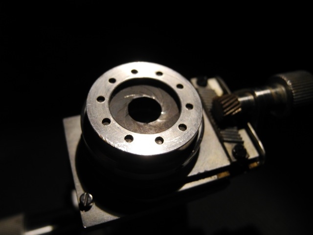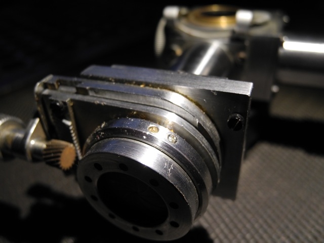 Die zweite Position ist normalerweise mit einem Umlenkprisma bestückt, das hier wohl fehlt. Prisma und Planglas haben unterschiedliche Vor- und Nachteile, daher kann man sie schnell wechseln, je nach Bedarf. Die Leuchtfeldblende geht tatsächlich bei diesen Opak-Illuminatoren nicht ganz auf, also bitte nicht mit Gewalt versuchen. Sie ist seitlich verschiebbar, damit man sie bei Nutzung des Prismas, das die halbe Apertur bedeckt, zentrisch in die verbleibende Hälfte stellen kann.