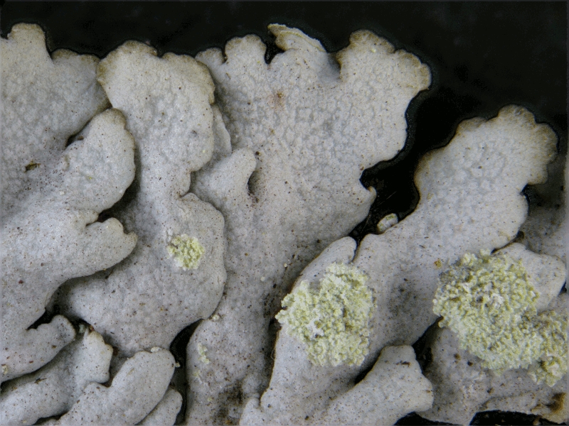 ich möchte mich gerne dem gegenwärtigen Trend der Auflichtmikroskopie und der 3D Darstellungen anschließen. Wie vielleicht nicht anders zu erwarten, habe ich mir eine Flechte als Versuchsobjekt ausgesucht. Fundort der Physica caesia ist eine Dachpfanne auf meiner Garage.