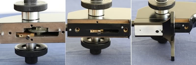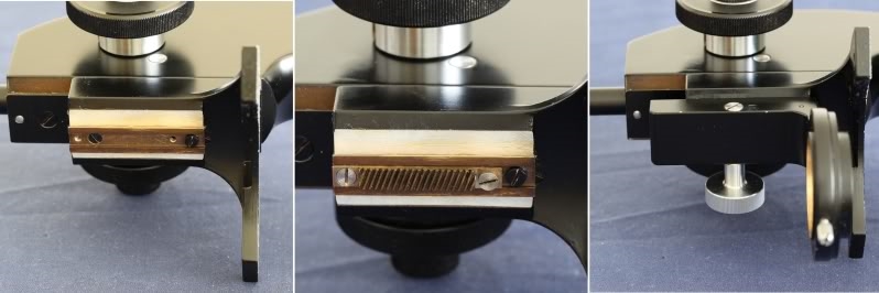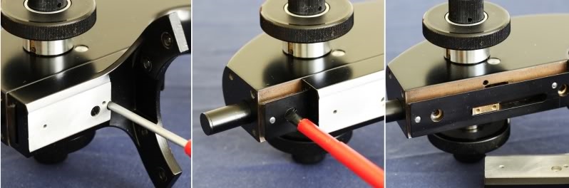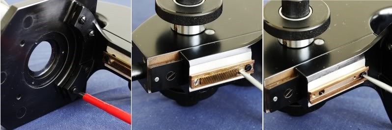 R: Abnahme der Schwalbenführung für die Kondensorverstellung. Auch hier sind unterschiedliche Schrauben für die Befestigung verwendet und sollten beim Rückbau nicht verwechselt werden.