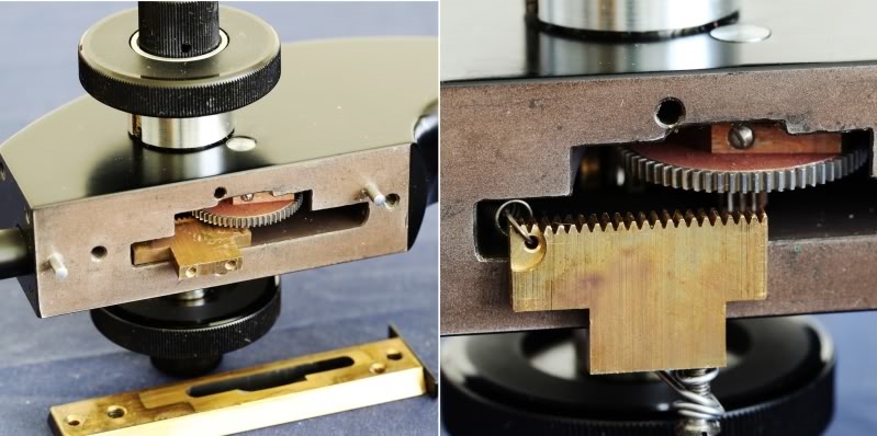 M: Um für die Reinigung und Neufettung an den Tischtrieb heranzukommen, müssen zunächst einige Teile demontiert werden. Hier ist die Abnahme der Zahnstange für die Kondensorverstellung gezeigt. Es ist zu beachten, daß die einzelnen Elemente oftmals mit unterschiedlich geformten Schrauben befestigt sind. Die Zahnstange z.B. ist am oberen Ende mit einer Zylinderkopf-, am unteren mit einer Senkschraube befestigt.