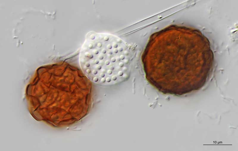 Hat schon mal jemand solche Zygosporen gesehen und weiß, von welcher Alge sie stammen? Oder liege ich mit der Bestimmung der Alge als C. multifilis falsch? Ich bin für jeden Hinweis dankbar, weil mir die Bestimmung der Zygosporen sehr wichtig ist, da viele von ihnen von einem Parasiten aus der Familie Chytriden befallen waren, wie z. B. die linke Zygospore, an der sich ein reifes Zoosporangium des Parasiten befindet.
