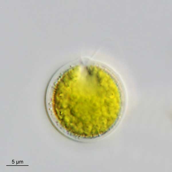 Hier einige Bilder ein Grünalge (Ø bis ca. 19 µm) und ihre asexuelle Vermehrung aus einem Teich mit einer Wasserblüte. Weil die Alge vier Geißeln, eine Papille, einen becherförmigen Chloroplasten, einen Augenfleck, kontraktile Vakuolen und ein Pyrenoid besitzt, habe ich sie als Carteria multifilis bestimmt.