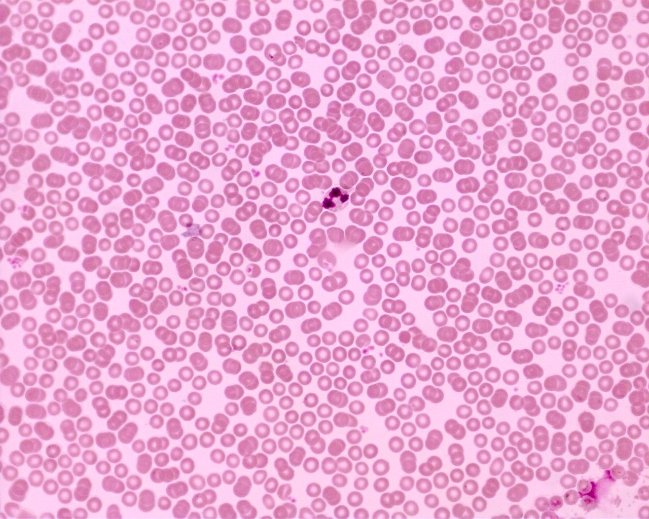 bei der Färbung eines Blutausstriches nach Pappenheim (May-Grünwald und Giemsa - Färbung) habe ich manchmal den Effekt, dass die Zellkern der verschiedenen Leukozyten nicht sauber dargestellt werden. Die Färbung des Zellkerns scheint zu verlaufen. Durch das Okular tritt das wesentlich stärker zur Geltung als hier auf dem Bild zu sehen ist.