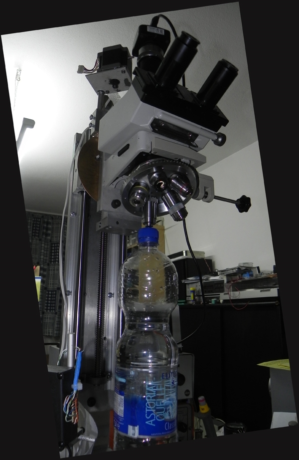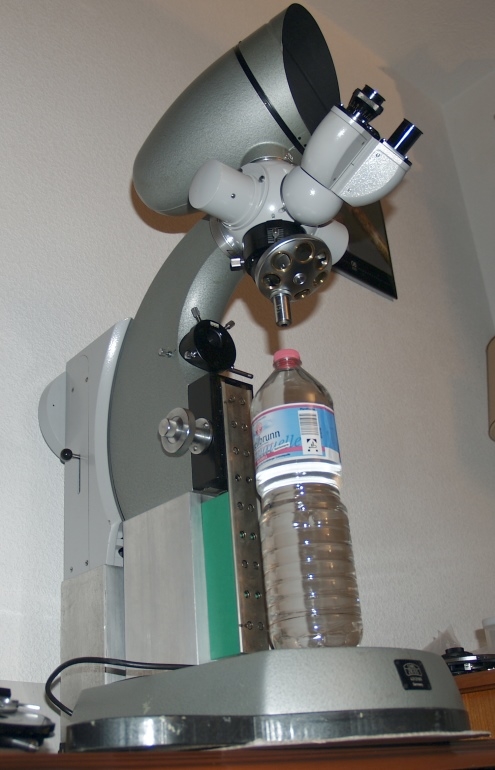 Nu ja, die Flasche ist Platzhalter für andere große Brocken. Und den Deckel abzuschrauben, dann geht ja der Pfus raus. Wolfgang, das alte Vergrößerungsgerät war mal ganz am Anfang ein Gedanke der aber aus Stabilitätsgründen verworfen wurde und außerdem fehlt dem Vergrößerer der große x-y-Tisch des Metalloplans genau so wie die gesamte Durchlichteinrichtung desselben. Ich denke mechanisch bin ich so weit durch. Jetzt kommt dann die Automatisation an die Reihe und eine ganze Menge Beleuchtungsvarianten.